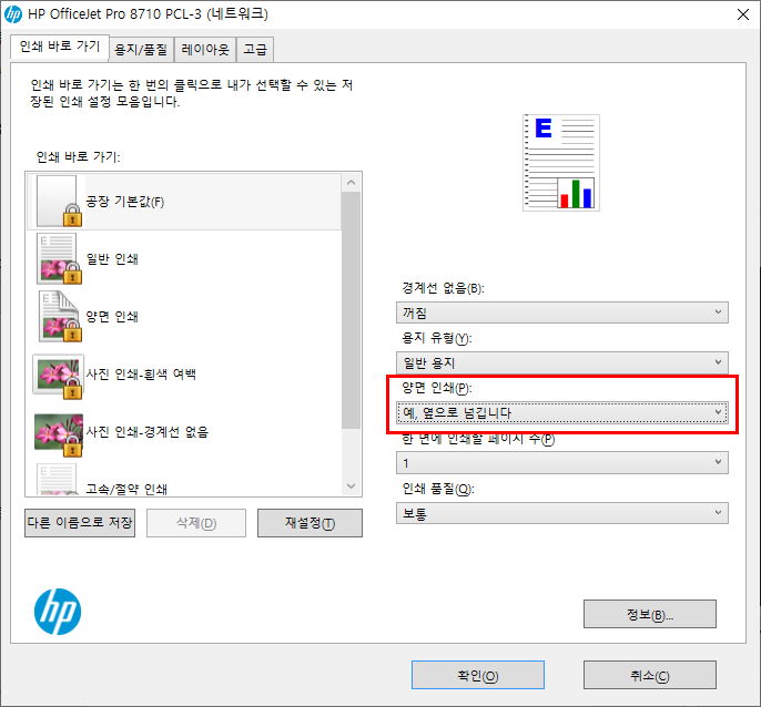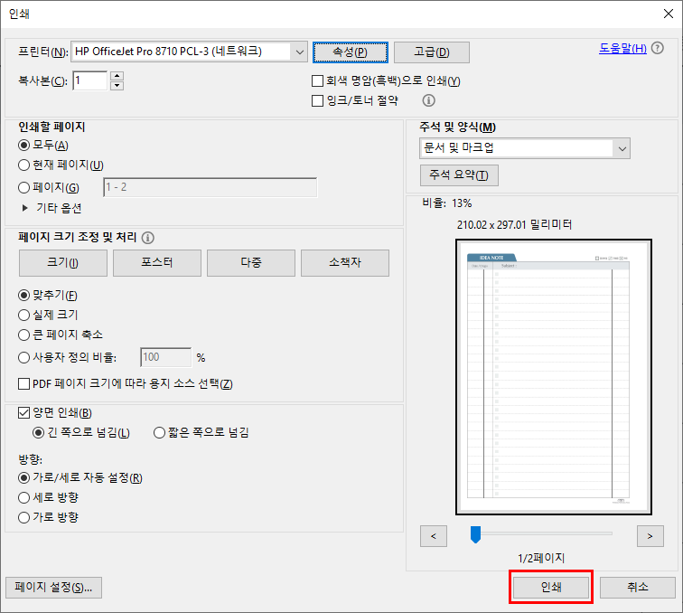 - 프린터 벤더에 따라 '긴쪽으로 넘김' 설정할 수도 있다.