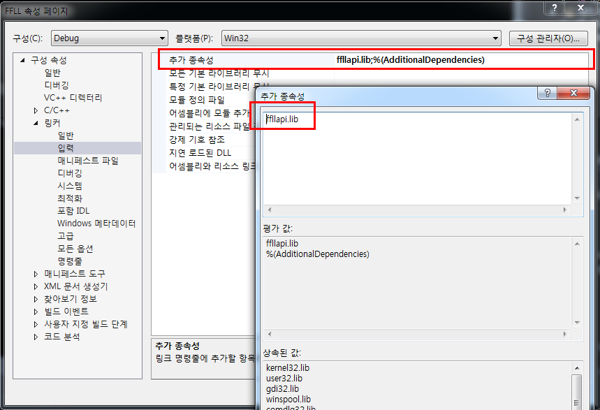 6. 프로젝트 속성 페이지에 '추가 종속성'에서 아래 파일를 추가한다.