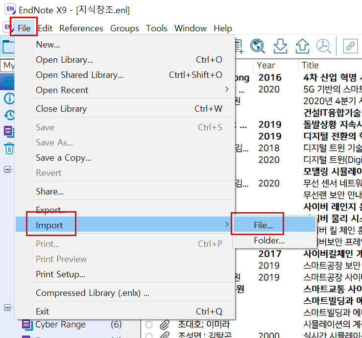 4. EndNote 프로그램 실행 후 "File → Import → File ..." 클릭한다.