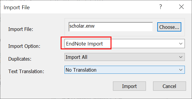 5. Import File 선택 후 Import Option를 "EndNote Import"로 선택한다.