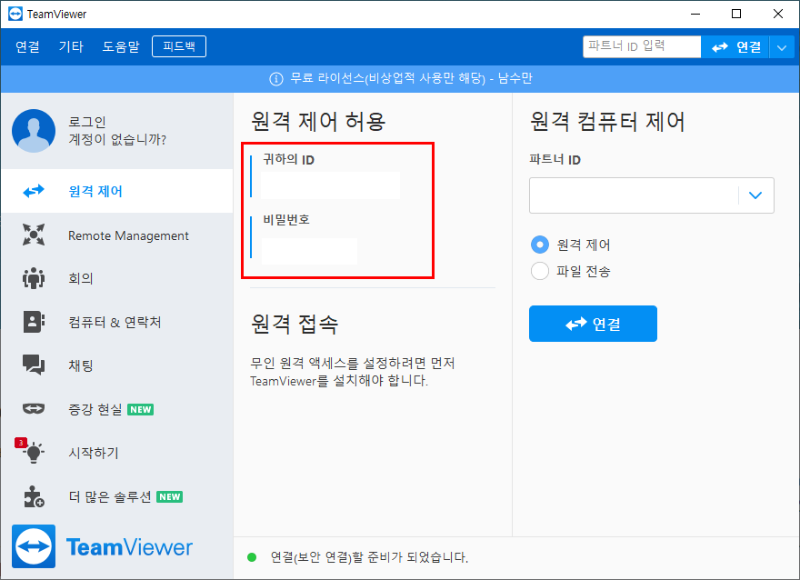 5. TeamViewer 실행 후, 귀하의 ID와 비밀번호 복사 후 알림